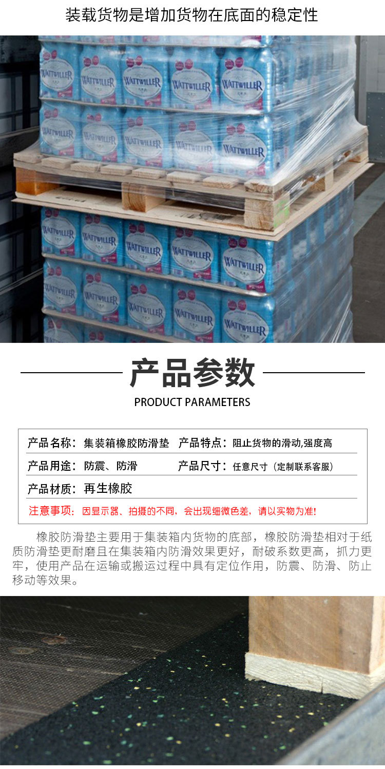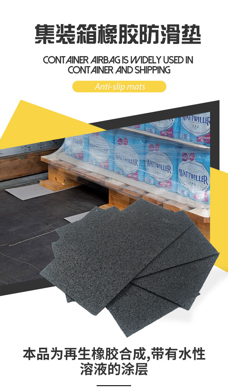 橡膠防滑墊主要用于集裝箱內貨物的底部,橡膠防滑墊相對于紙質防滑墊更耐磨且在集裝箱內防滑作用更好,耐破系數更高,抓力更牢,使用產品在運輸或搬運過程中具有定位作用,防震、防滑、防止移動等作用。