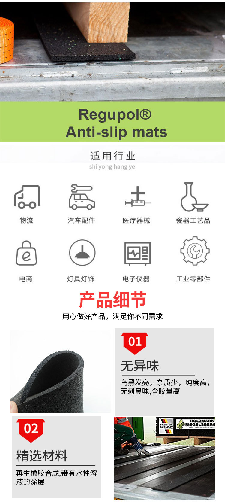 本品為再生橡膠合成,帶有水性溶液的涂層,其厚度3mm-5mm.本品可回收和重復使用,不起灰,符合食品和日用品的規范.本品表面毛躁,可以可靠地阻止貨物的滑動,并且強度高,溫度耐受性可從-20到+70°C. 靜態摩擦系數0.95。